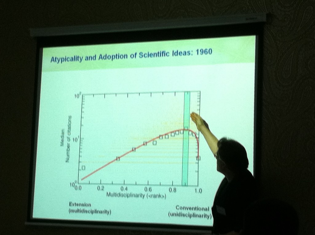 Here is Brian Uzzi, whose discussion of the adoption of scientific ideas provided some good laughs, and set some brains ticking over how they might improve the likelihood of increased citation rates for themselves. If only it were as simple as citing the right papers and collaborating across wide distances.